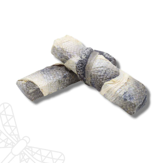 Fish Jerky Bars: Fish Jerky Bars are natural dental sticks that have a naturally abrasive texture due to their dried whitefish skin composition. This rough texture helps in the mechanical removal of plaque and tartar from a dog's teeth as they chew on the treat, supporting dental cleaning.
