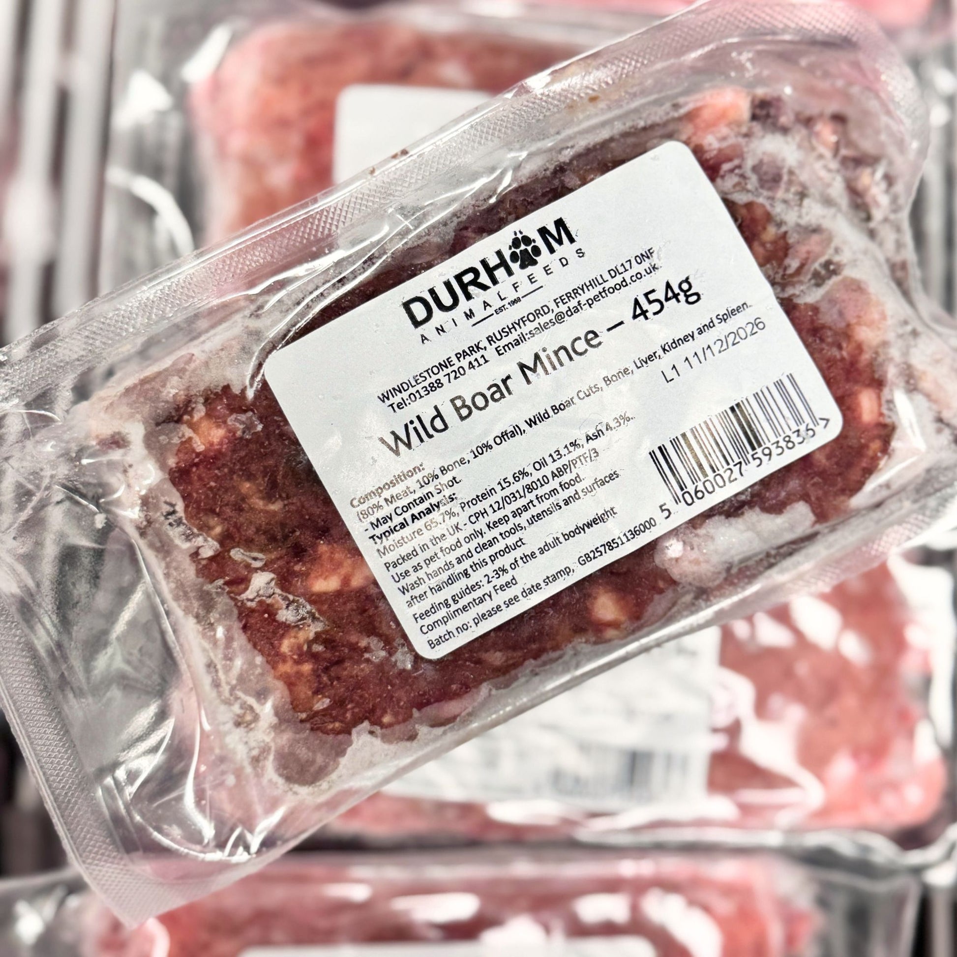 Wild Boar is a seasonal 80:10:10 mince with less than 10% fat. It’s a great novel protein for dogs who’ve been on raw for a while and enjoy something a little different in their bowl. As with most game meats, it’s generally not recommended for raw-feeding newbies — but for experienced dogs, it’s a tasty and exciting change of pace.