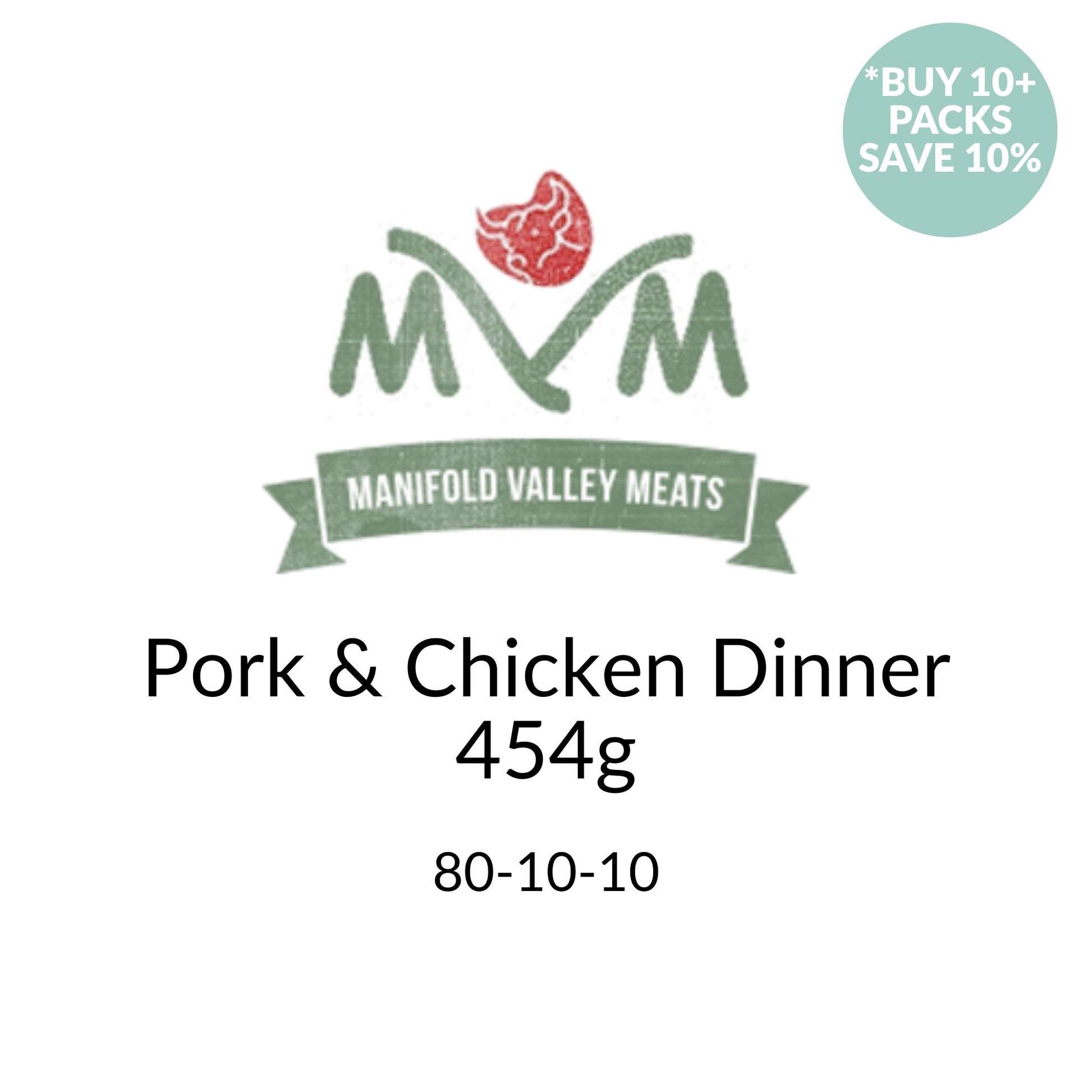 MVM Chicken & Pork Dinner is a fine-ground mince in sausage-style rolls, pairing lean chicken with hearty pork. This 80:10:10 blend offers a smooth texture and balanced variety of proteins.