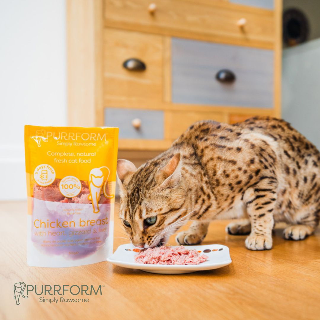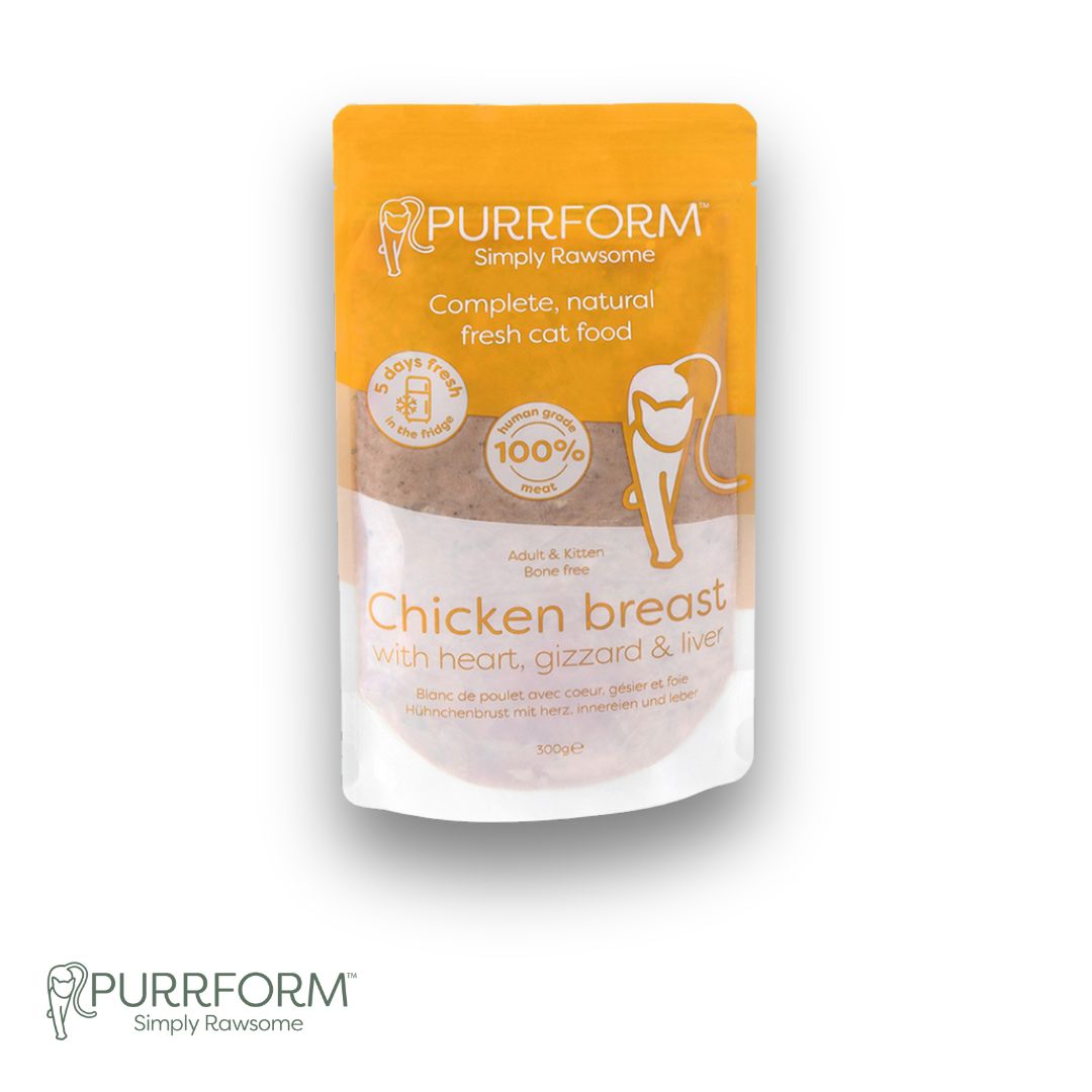 The PurrForm 5 Days Fresh range is packed with protein and offers a convenient way to serve fresh cat food every day. It has gone through High Pressure Processing (HPP) to maximise freshness and maintain a longer shelf life once defrosted. Unlike cooking, HPP has minimal, to no effect, on nutritional value, vitamins, or minerals, with no compromise on taste.